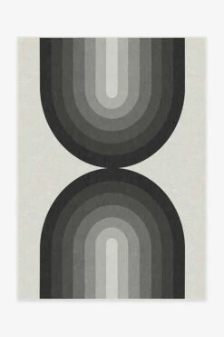 One of our most popular styles now available in grey! Influenced by the designs of Bauhaus artist Josef Albers, this rug features repeated arches in a greyscale color palette on a nearly white backdrop. Water-resistant, stain-resistant, and machine-washable.