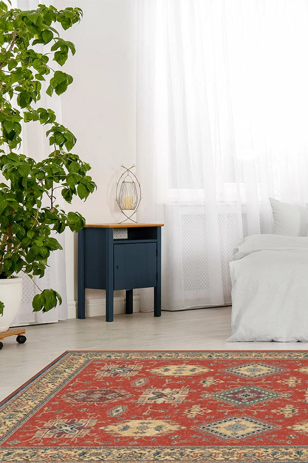 Inspired by Kazak kilim rug designs, Ademi Paprika Red Rug blends intricate pattern work with rich, elegant hues of ember, sunburst, rust red, orange, and sage green. Styled in true Persian rug fashion, this worldly accent brings instant sophistication to any space.