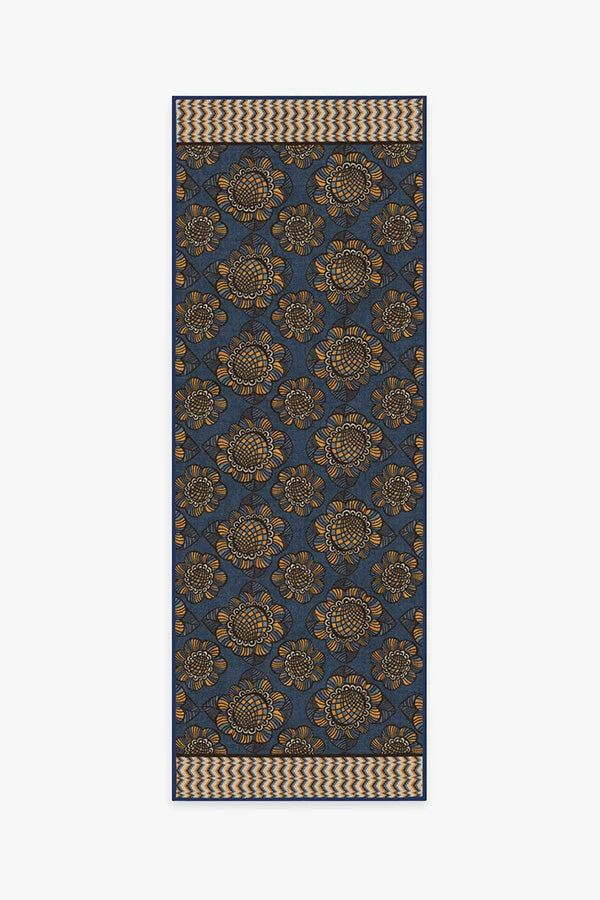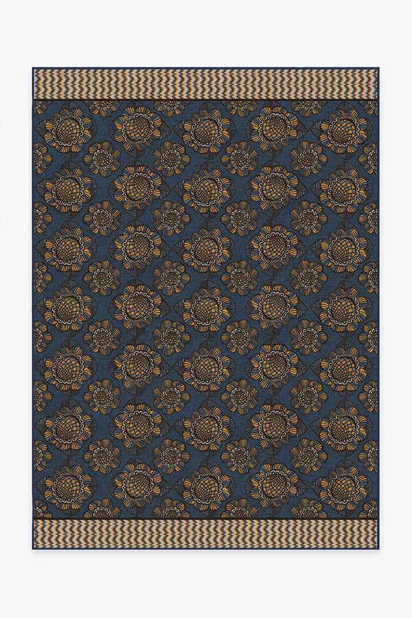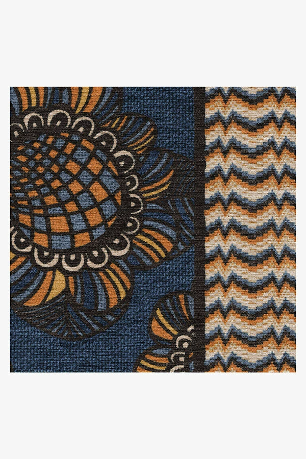 Floral finesse. Our Anna Sui Retromania Daisy Golden Azure Rug takes inspiration from a pattern in the fashion designer’s Fall 2015 collection, inspired by Scandinavian-style prints popularized during the mid-century. This rug features repeating daisies in gold set atop a navy background with a playfully striped border. Made from our water-resistant, stain-resistant, and machine-washable low-pile Chenille material.