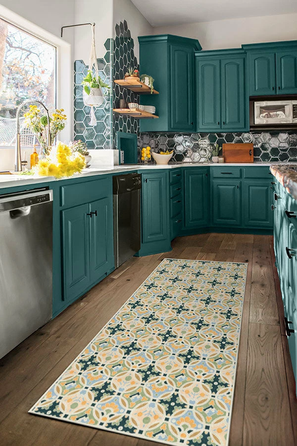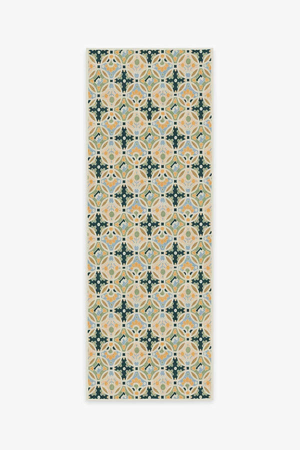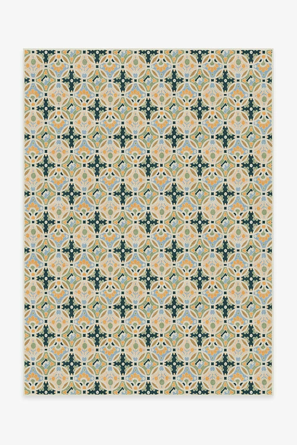 An eye-catching piece. Our Anna Sui Sullivan Citrus Rug features a lively pattern reminiscent of stained glass window panes in shades of yellow, blue, green, and beige set against a dark teal background. Made from our water-resistant, stain-resistant, and machine-washable low-pile Chenille material.