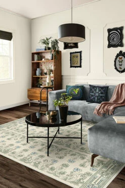 Darling and dreamy. Our Anna Sui Vintage Rose Art Nouveau Sagebrush Rug features a pattern first seen in the fashion designer’s Spring 2014 collection, inspired by English Pre-Raphaelite artwork. This design features art-nouveau flowers in delicate shades of green and light blue set atop a cream background. Made from our water-resistant, stain-resistant, and machine-washable low-pile Chenille material.