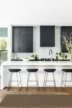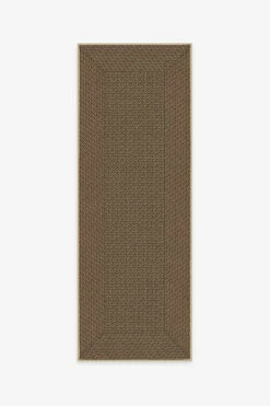 A versatile design that’ll complement any decor style. This washable rug looks like a hand-braided textile in a neutral palette. The light sand and natural tan colors create a braided jute-like appearance. Made with recycled + virgin polyester, and polyurethane.