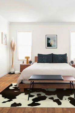 Add a touch of rustic sophistication to your space. Our Brown and Black Faux Cowhide Rug is made from a cushioned, medium-pile polyester and polyurethane material that offers the look of real hide without the inconvenience. Durable, shed-resistant, and machine-washable.