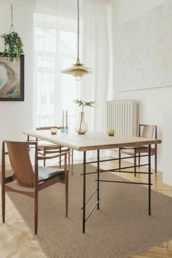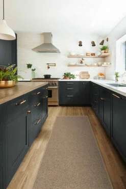 A warm and earthy tone with natural jute texture. This rug blends shades of light and natural tan to create a heavy linen, burlap look. Its natural color and washable jute-like material make it perfect for any space. Made with recycled + virgin polyester, and polyurethane.