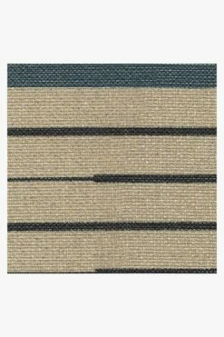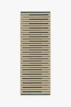 Stripes get an upgrade. Black lines of varying thickness sit on a natural tan-colored background, capped with green ends for a modern look, made with a washable woven material that gives it a jute-like appearance. Made with recycled + virgin polyester, and polyurethane.