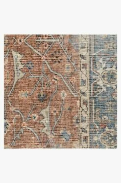 Celestine Coral Rug features a classic floral theme in playful coral and blue hues. Its vintage inspired design mimics an intricate floral vine lattice panel with a bordered grid-like pattern completed with a beautifully distressed texture.