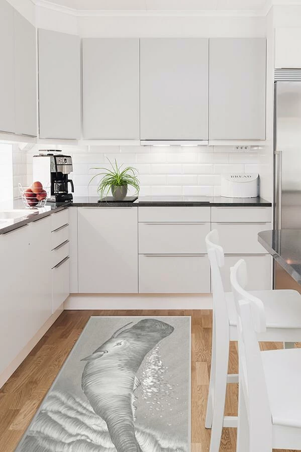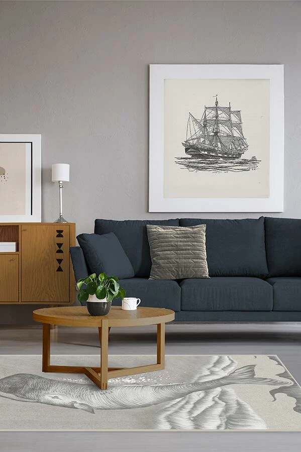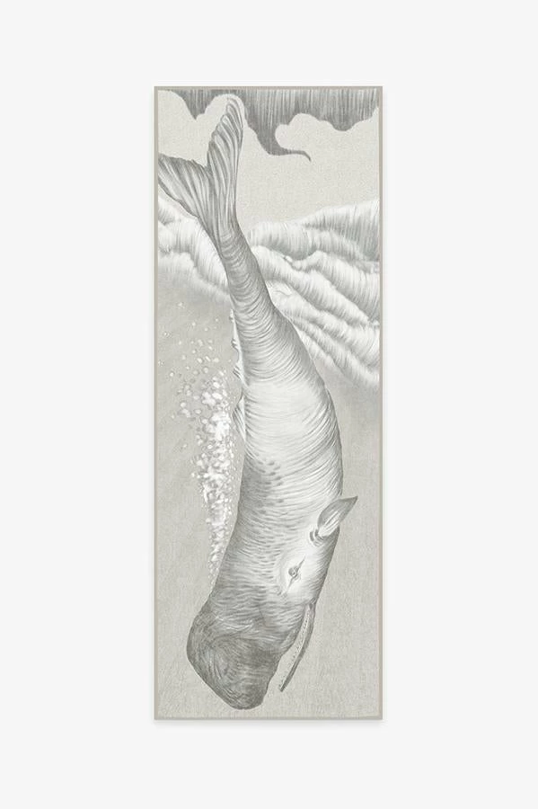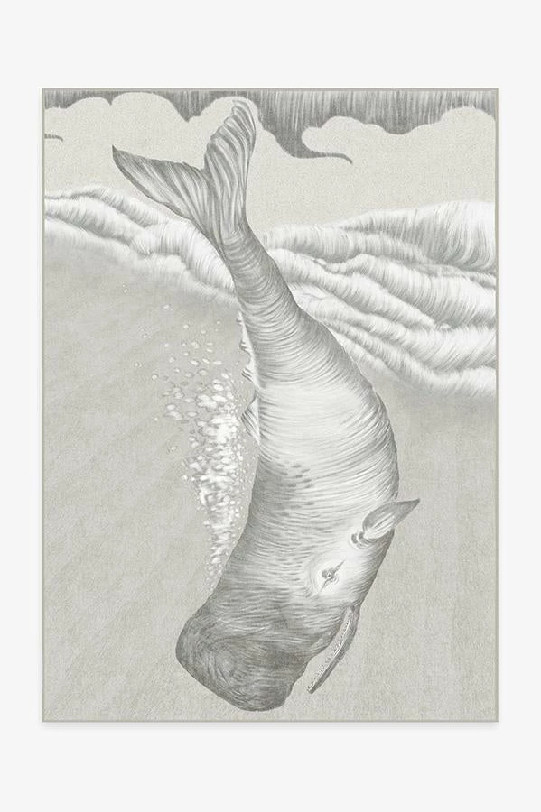 Inspired by Greek mythology, our charming scrimshaw style Cetus Charcoal rug depicts a hand-etched whale swimming amongst the clouds in soft hues of neutral grey.