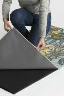 Our Dalilah Capri rug features a retro-feeling floral motif in a palette of warm yellows and pale blues.