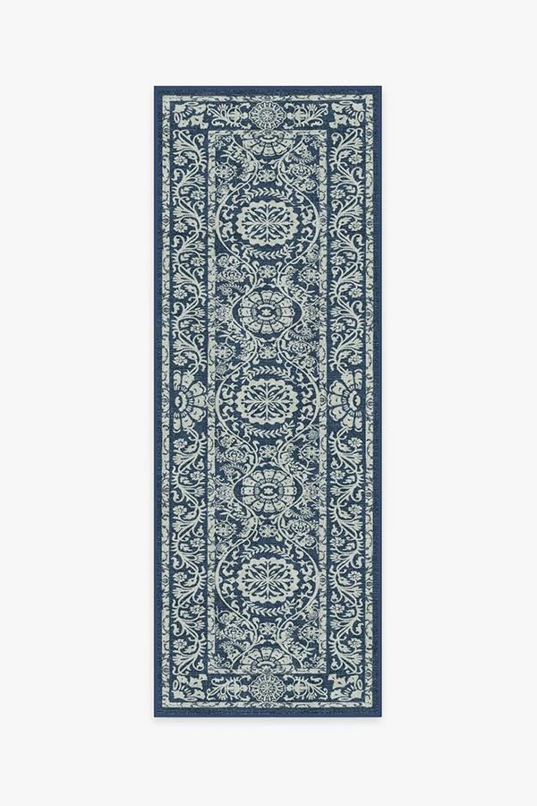 Delphina Navy Blue Rug takes its design cues from the art of woodblock printing. Featuring intricate floral and vine details, this navy blue rug plays up a classic style in a modern colorway.