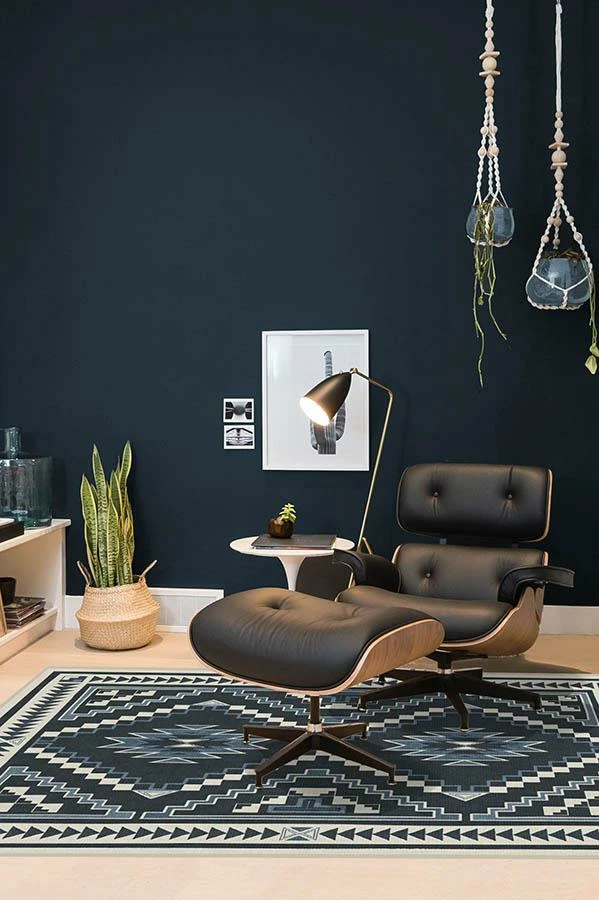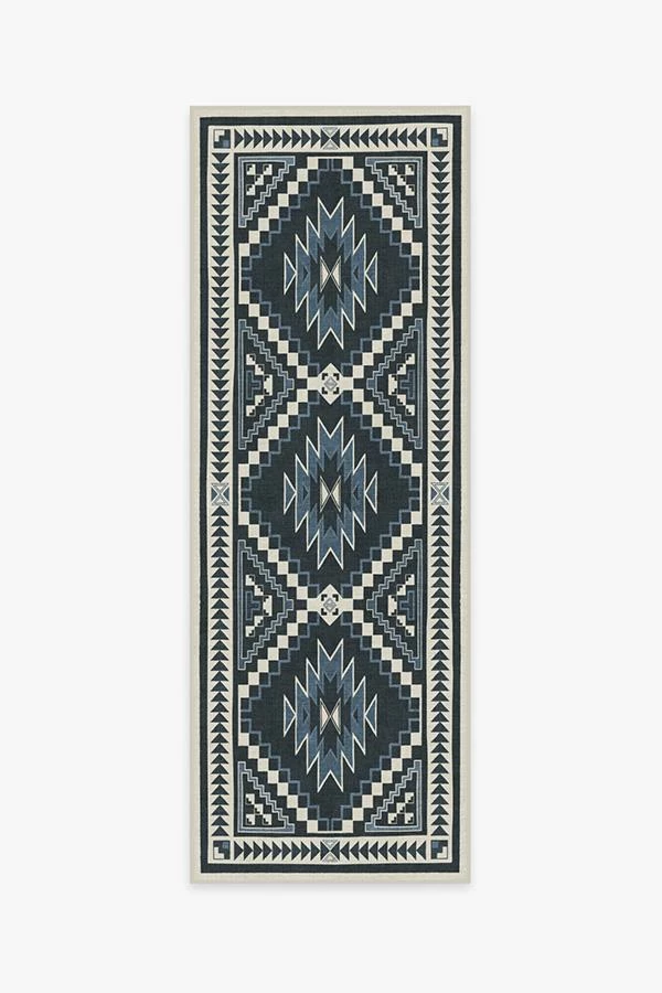 The Desert Ivory Blue Rug features a central diamond pattern surrounded by four corner triangles in striking hues of ivory and slate blue. Inspired by Southwestern motifs, this blue and white geometric rug will make a statement in any room.