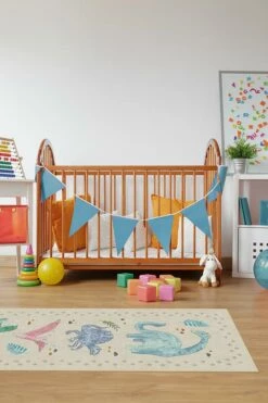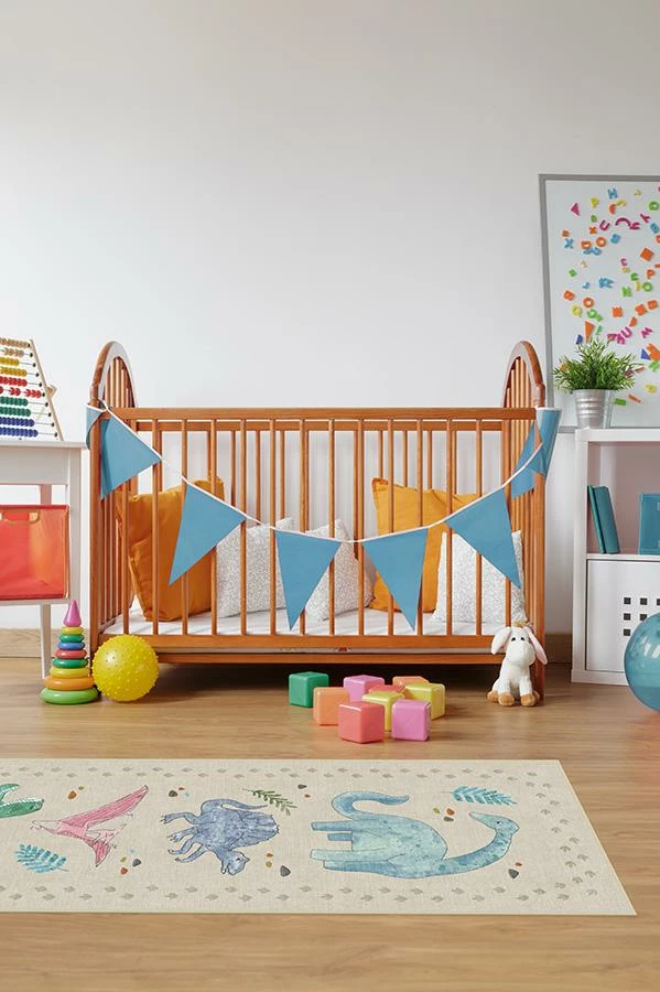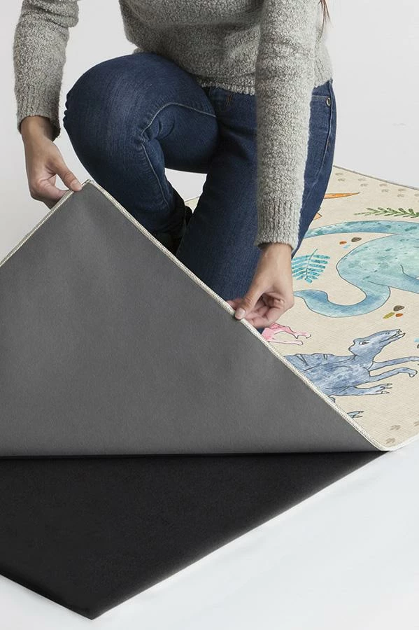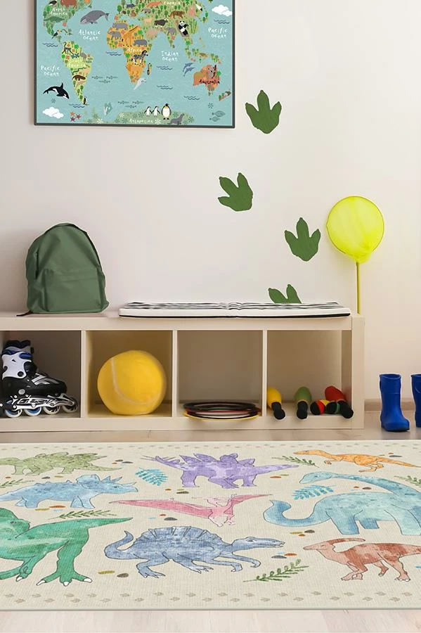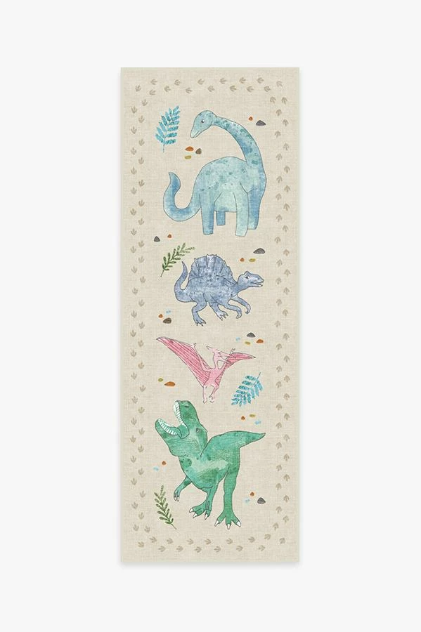 We’re celebrating our favorite prehistoric creatures with the Dinosaur Parade Multicolor Rug. Pastel watercolors give this design a textural effect, while dino footprints flank the border for added oomph. Featuring an all-star cast of baby dinosaursοΏ½οΏ½οΏ½ pterodactyl, T. rex, triceratops, brontosaurus, parasaurolophus, stegosaurus, velociraptor, and spinosaurus, this fun rug brings a classic Jurassic look to any child’s space.