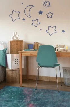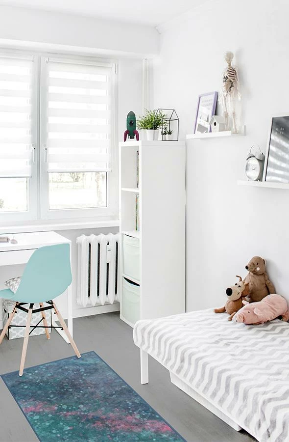 Invite your future astronauts to explore the universe with our Galaxy Rug. Celestial hues of turquoise, pink, and navy blue come together to create this abstract design with ethereal texture that depicts the infinite galaxy. A perfect rug to bring an out-of-this-world touch to any kids’ room or playroom.