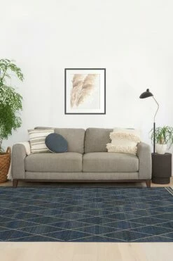 The new neutral. Vivid tones of blue, slate, teal, and navy create a subtle striation overlaid with a tan diamond trellis pattern. This rug’s washable woven texture in natural tan mimics jute. Made with recycled + virgin polyester, and polyurethane.