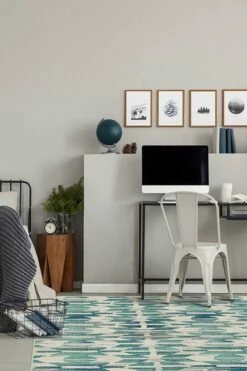 Our Hesperia Teal Rug features a blue-teal color palette that accentuates its chevron motif.