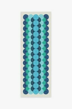 Mod and evocative of disco divas of yore. This graphic rug features layered rows of circles in a vibrant color palette of royal blue, turquoise green, cerulean, and deep navy blue on an off-white background. Water-resistant, stain-resistant, and machine-washable.