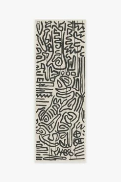 Edgy and modern. Our Keith Haring Freestyle Black and Ivory Rug features a single-line design of dark grey on an off-white background and is sure to catch the eye anywhere it’s placed. Water-resistant, stain-resistant, and machine-washable.
