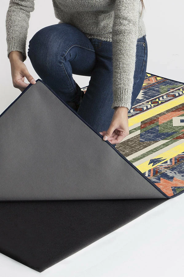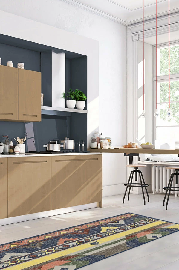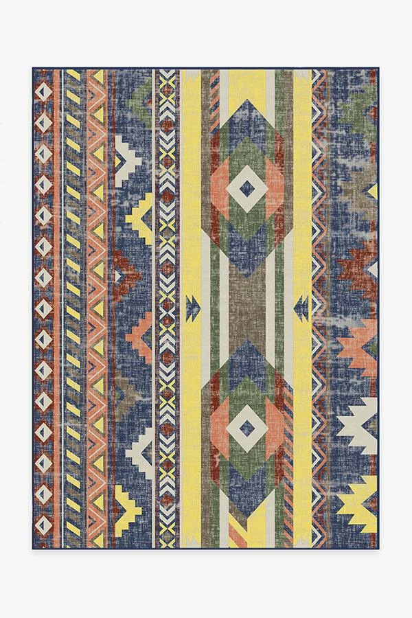 Kilim Batik Navy Rug features a head-turning color combination and a beautiful geometric pattern inspired by Turkish kilim rugs. Blending blue, grey, and yellow with pops of green and orange, this blue kilim rug is the perfect addition to your home decor to get that effortless bohemian look.