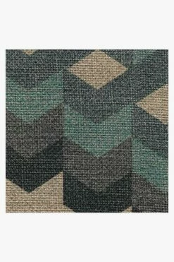 Southwestern flair in brilliant blues. This rug features small arrowhead shapes in shades of teal, dark navy, and grey that combine to form a larger geometric diamond pattern. The natural tan woven material gives it a jute-like appearance that’s easily washable. Made with recycled + virgin polyester, and polyurethane.