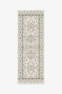 The Leelu Black and White Rug is inspired by the traditional Caucasian rug design. Featuring a highly intricate web of sleek lines and geometric shapes, simplified with a bicolor scheme of neutral grey and pearl, this rug has an understated cool vibe.