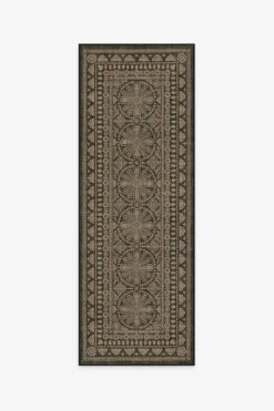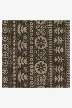 An intricate and elegant design. This traditional rug features a border pattern with delicate flowers and leaves in black on a natural tan background. It is made from a washable woven material that has a jute-like texture. Made with recycled + virgin polyester, and polyurethane.