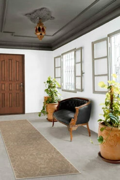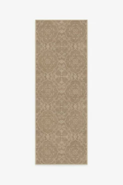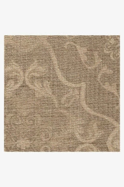Intricate and elegant. Our Mirabella Oatmeal Re-Jute Rug has a repeating geometric pattern inspired by the tile designs in Rococo architecture in light beige on a jute-colored background. The woven jute-like material is made from recycled and virgin polyester, and polyurethane that won’t shed or fray. Water-resistant, stain-resistant, and machine-washable.