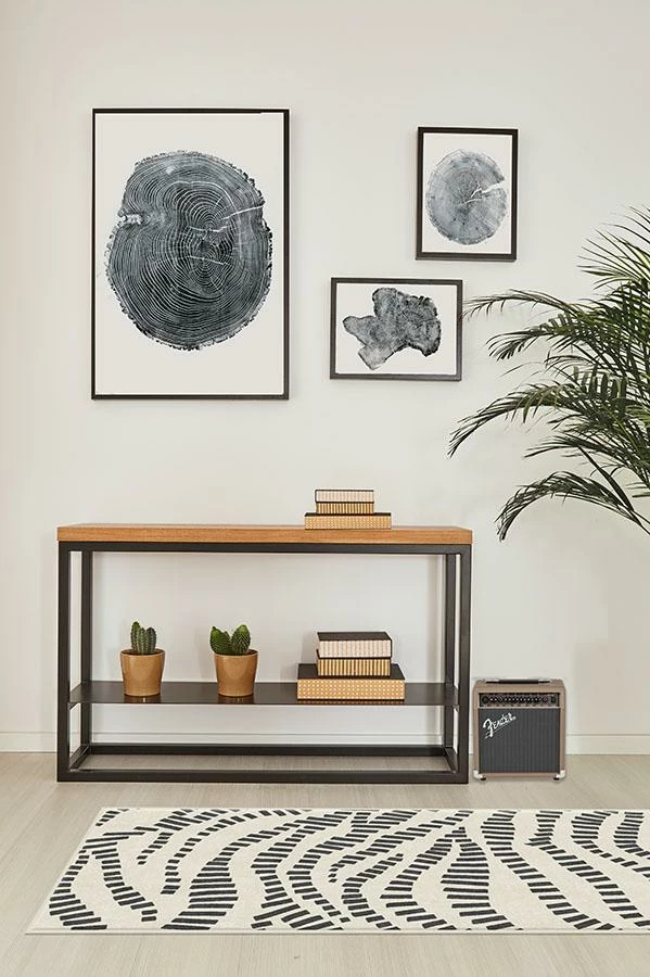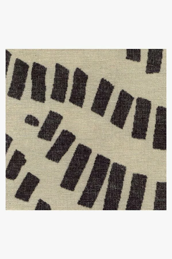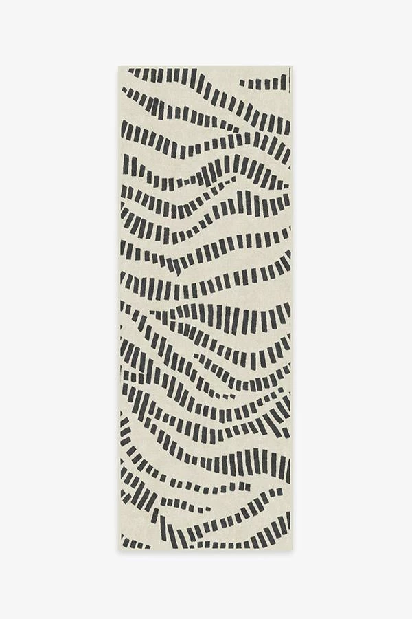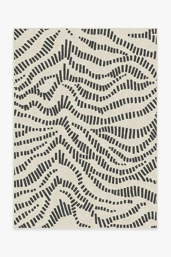 This contemporary Naila Black rug uses hatch marks to create an abstract wave motif in neutral grey over cream.