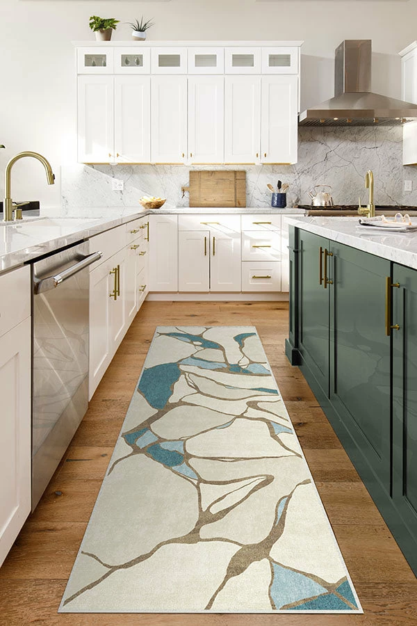 Serene like oceans and streams. Our Nina Takesh Aude Teal and Ivory Rug features a unique design of teal, blue-green, ivory, and bronze shapes swirled together. Made from our water-resistant, stain-resistant, and machine-washable low-pile Chenille material.