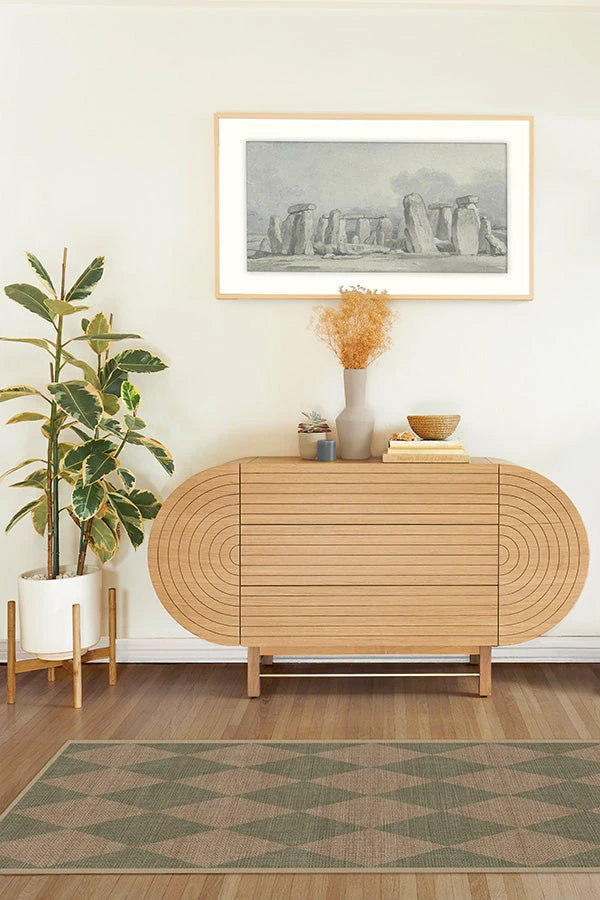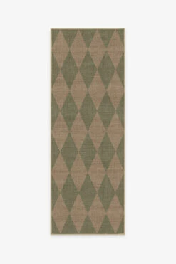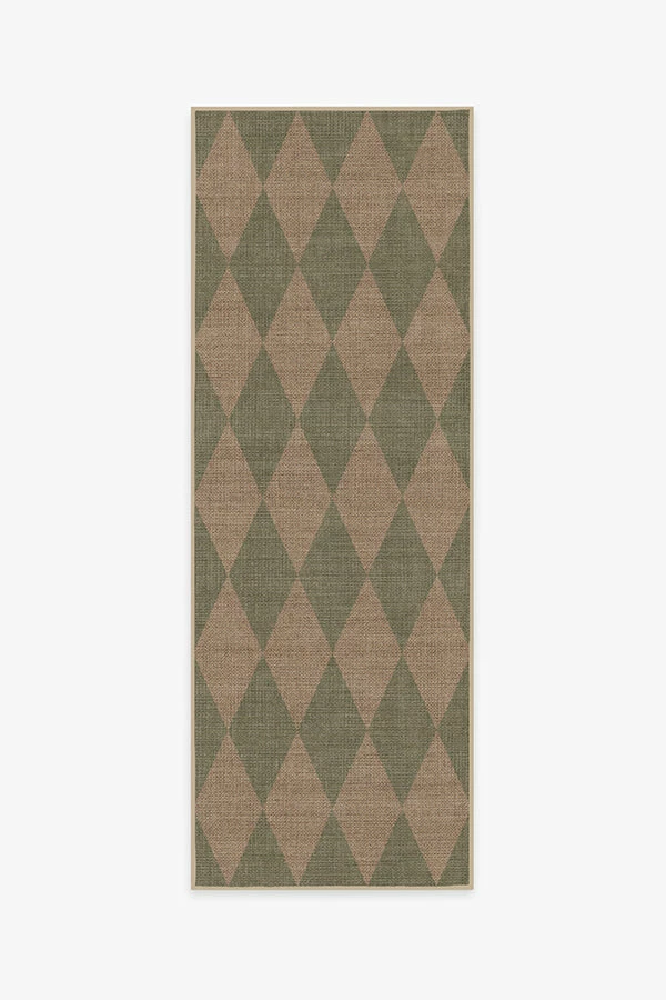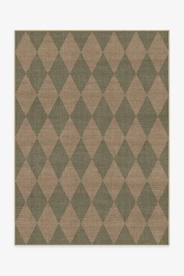 Have a little fun with our Palazzo Sage Green Re-Jute Rug. This desaturated sage green and warm beige diamond design is inspired by the harlequin floors in Italian palatial buildings and will give your space the hint of boldness youโve been looking for. The woven jute-like material is made from recycled and virgin polyester, and polyurethane that won’t shed or fray. Water-resistant, stain-resistant, and machine-washable.