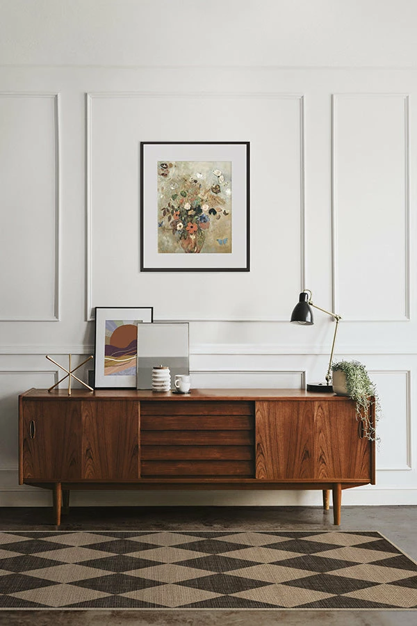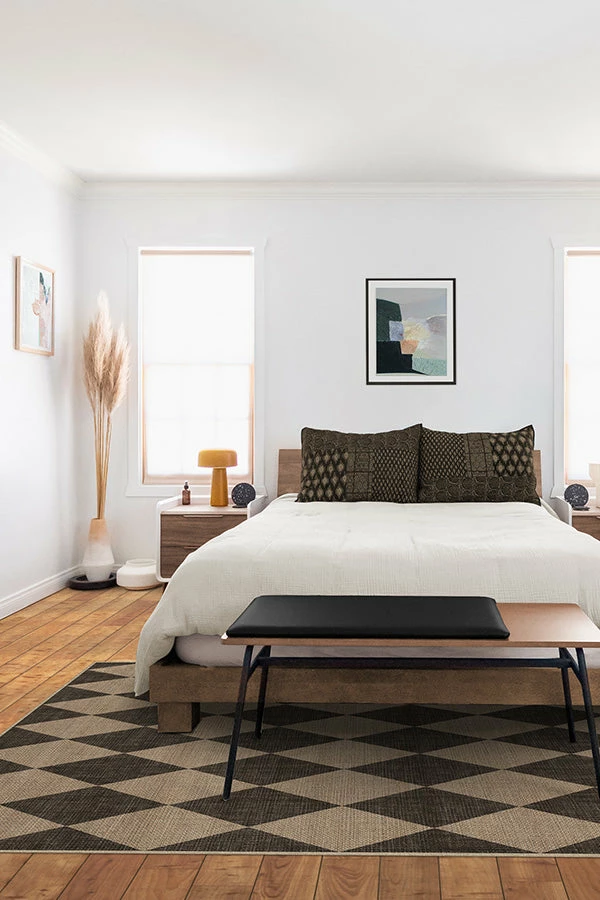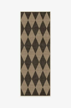 A whimsical pattern in a classic color palette. Our Palazzo Soft Black Re-Jute Rug is inspired by the harlequin floors seen in Italian palatial buildings. The eye-catching design features a soft, weathered black shade on a jute-colored background and is sure to be a distinct decor piece in a variety of spaces. The woven jute-like material is made from recycled and virgin polyester, and polyurethane that won’t shed or fray. Water-resistant, stain-resistant, and machine-washable.