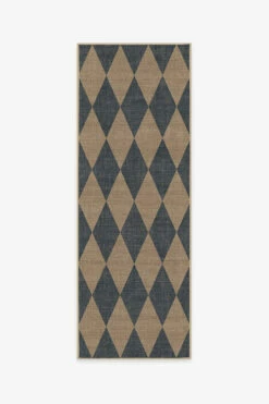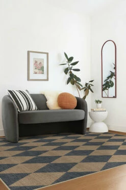 Add some dimension to your home with our Palazzo Soft Navy Re-Jute Rug. Inspired by the harlequin floors in Italian palatial buildings, this fun geometric design in midnight blue on a warm beige background is the statement piece you’ve been looking for. The woven jute-like material is made from recycled and virgin polyester, and polyurethane that won’t shed or fray. Water-resistant, stain-resistant, and machine-washable.