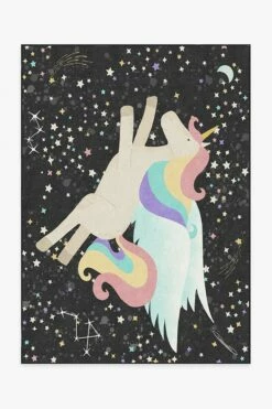 The Pegasus Rug brings to life our favorite enchanted creature, sprinkling a touch of magic and fun to any kid’s space. Featuring a hand-drawn unicorn, with a pastel rainbow mane and tail, flying through the cosmos of watercolor stars, planets, and the moon, this playful kids rug rug will inspire hours of make-believe.