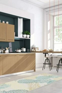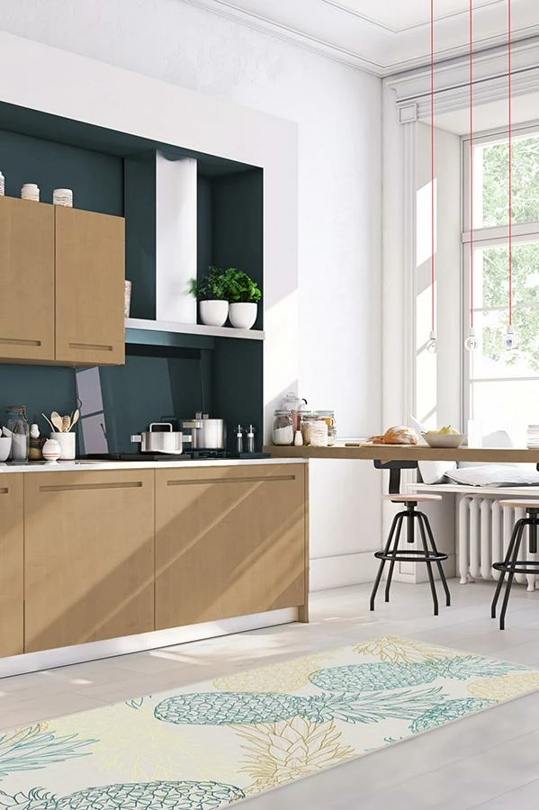 Our Pina Teal Rug welcomes home the relaxing vibe of the tropics. This linework motif features hand-drawn pineapples, tinted in hues of yellow and teal blue, playfully tossed about on a backdrop of pearl.
