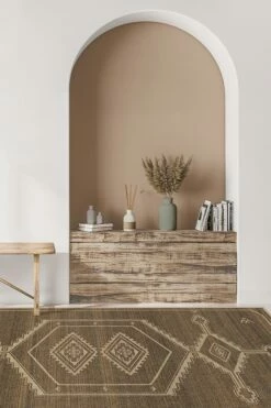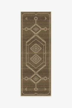 A geometric design with Southwestern flair. Sleek lines and shapes form a striking pattern in brown, tan, and golden beige shades. This washable rug is made from a woven material that mimics a natural jute look and texture. Made with recycled + virgin polyester, and polyurethane.