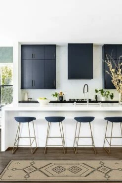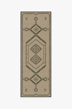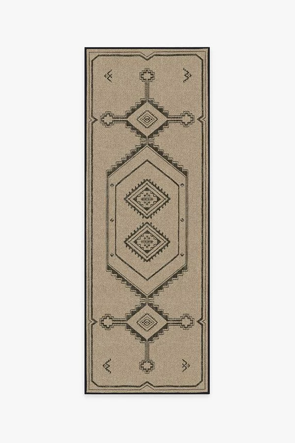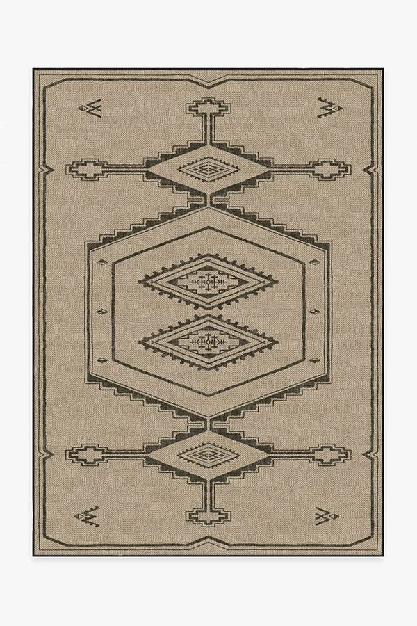 Here’s an easy way to spice up your space. This rug uses sleek lines and geometric shapes, tinted in black on a natural tan background. Made with a washable woven material that gives it a jute-like appearance. Made with recycled + virgin polyester, and polyurethane.