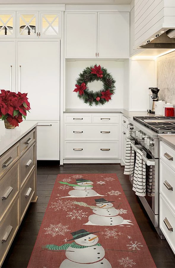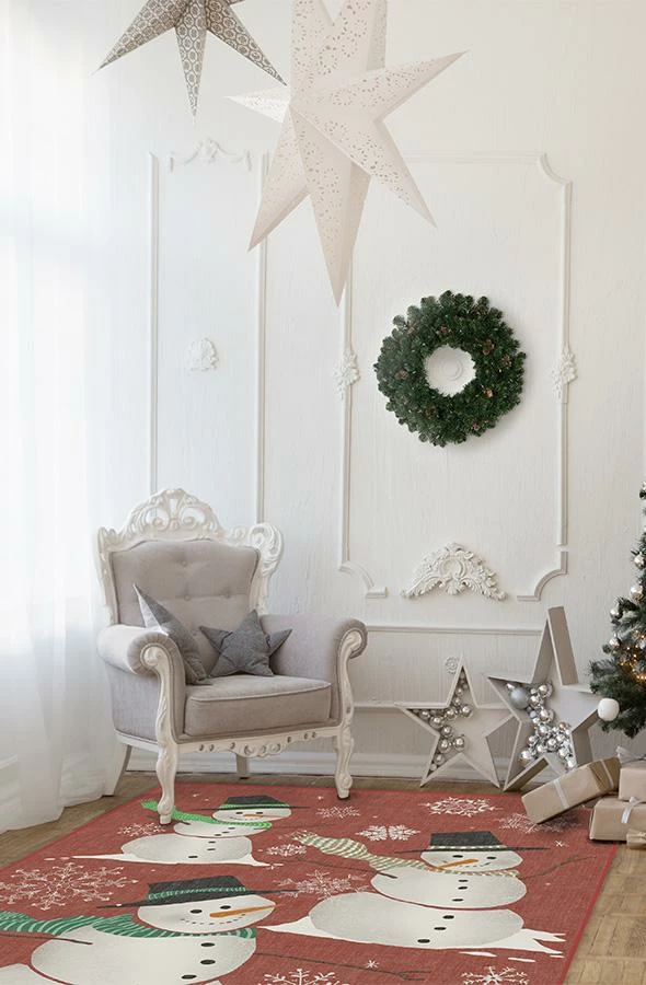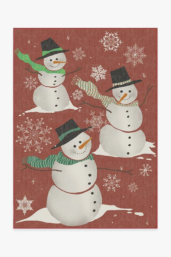 Sure to put a smile on your face. Our jolly Snowman Rug displays three frosty snowmen and delicate snowflakes in festive hues of pearl, evergreen, and farmhouse red to create a cheerful, winter-wonderful home. Made from our water-resistant, stain-resistant, and machine-washable low-pile Chenille material.