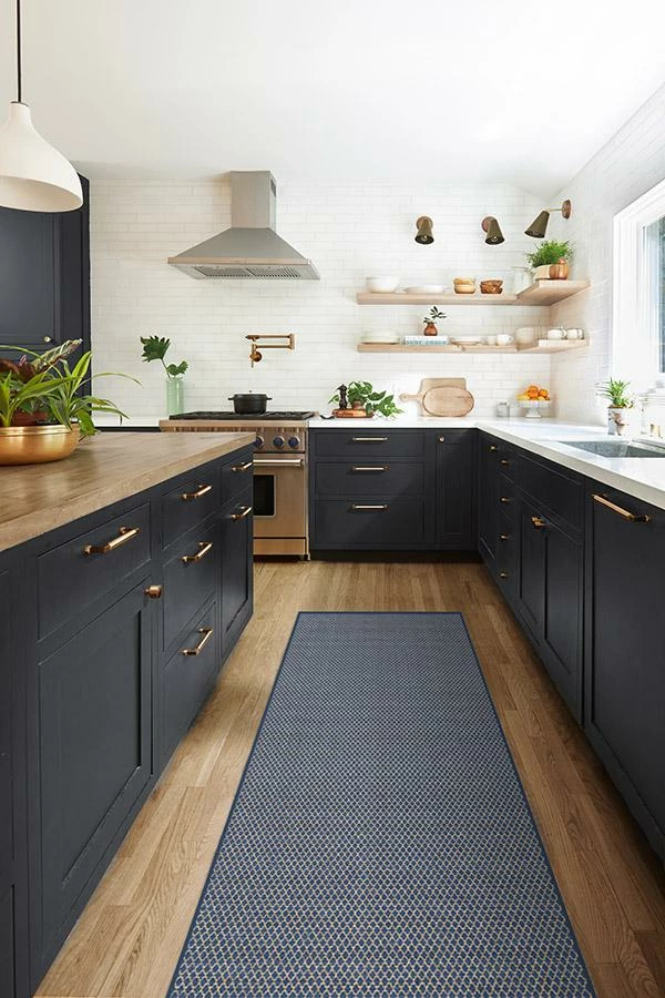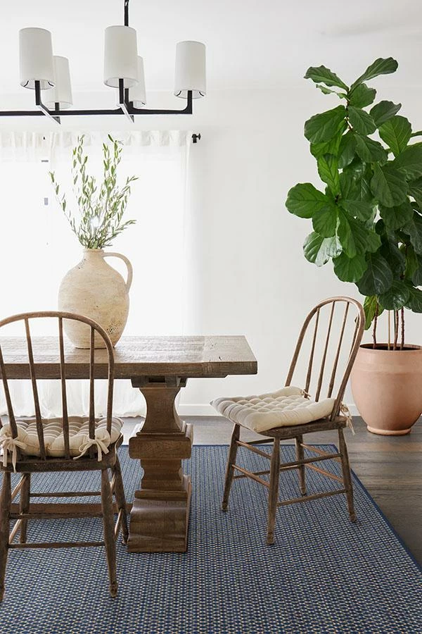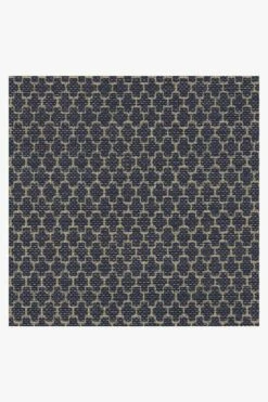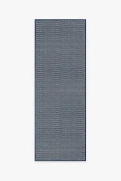 This blue is anything but boring. This navy blue rug features a pattern of small diamond tiles, giving it a solid color with lots of textures. It is made with a washable jute-like material that makes it easy to clean. Made with recycled + virgin polyester, and polyurethane.
