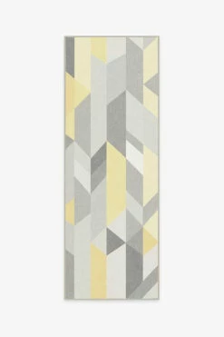 Give your home a pop of color with our Urbano Canary Yellow Rug. This yellow geometric rug features a mix of parallel and diagonal lines in shades of yellow and grey, forming triangles, diamonds, and other interesting shapes that can enliven any space.